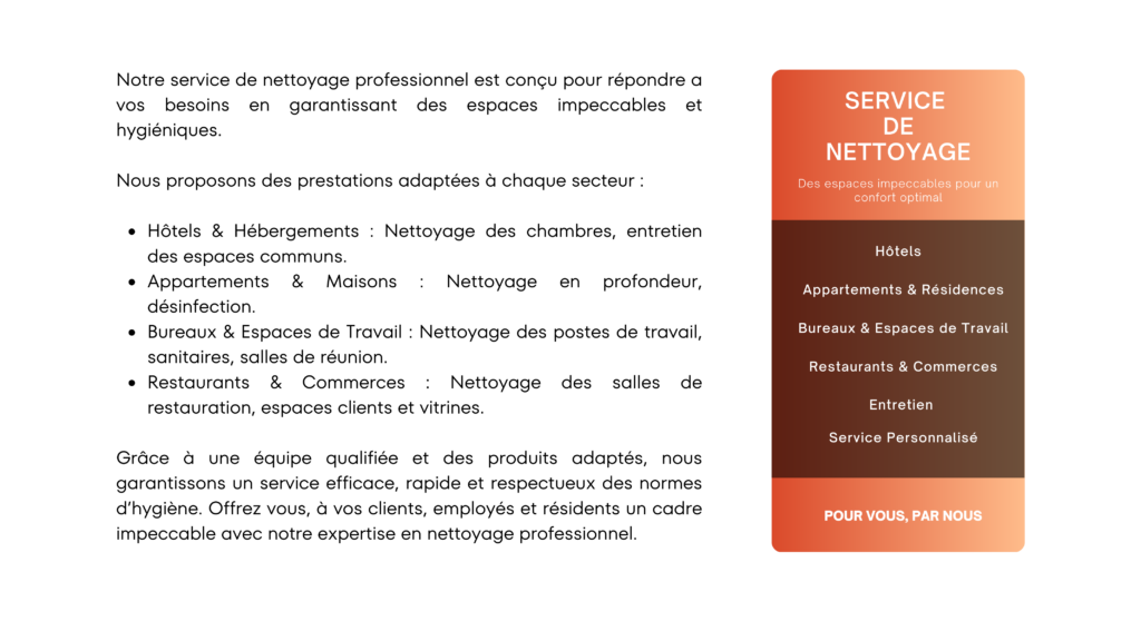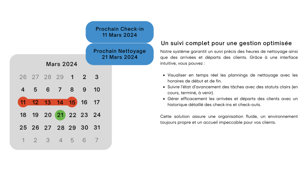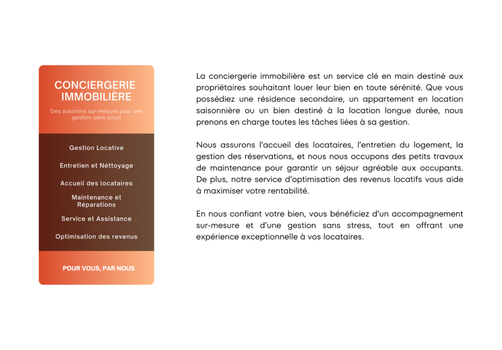 Accueil Services La solution pour votre gestion Nos Services Faq Foire Aux Questions Quels sont les services que vous proposez ? Nous offrons une gestion complète de vos biens immobiliers, incluant le nettoyage, l’optimisation et la diffusion de vos annonces, ainsi que des conseils marketing pour maximiser vos réservations. Comment obtenir un devis ? C’est simple ! Contactez-nous via notre site ou par téléphone, et nous vous proposerons une solution personnalisée adaptée à vos besoins.